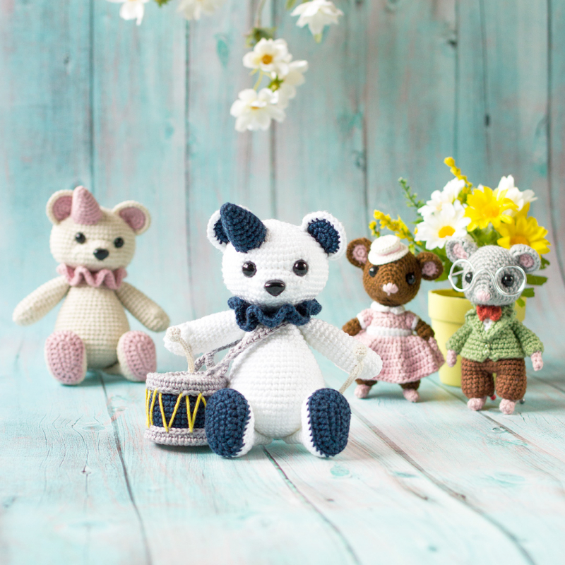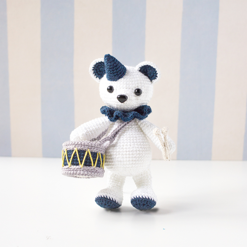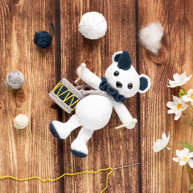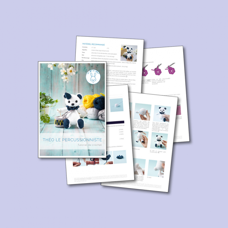 Livret d'explications pour crocheter Théo le nounours percussionniste, imprimé en couleurs sur un joli papier épais et écoresponsable.